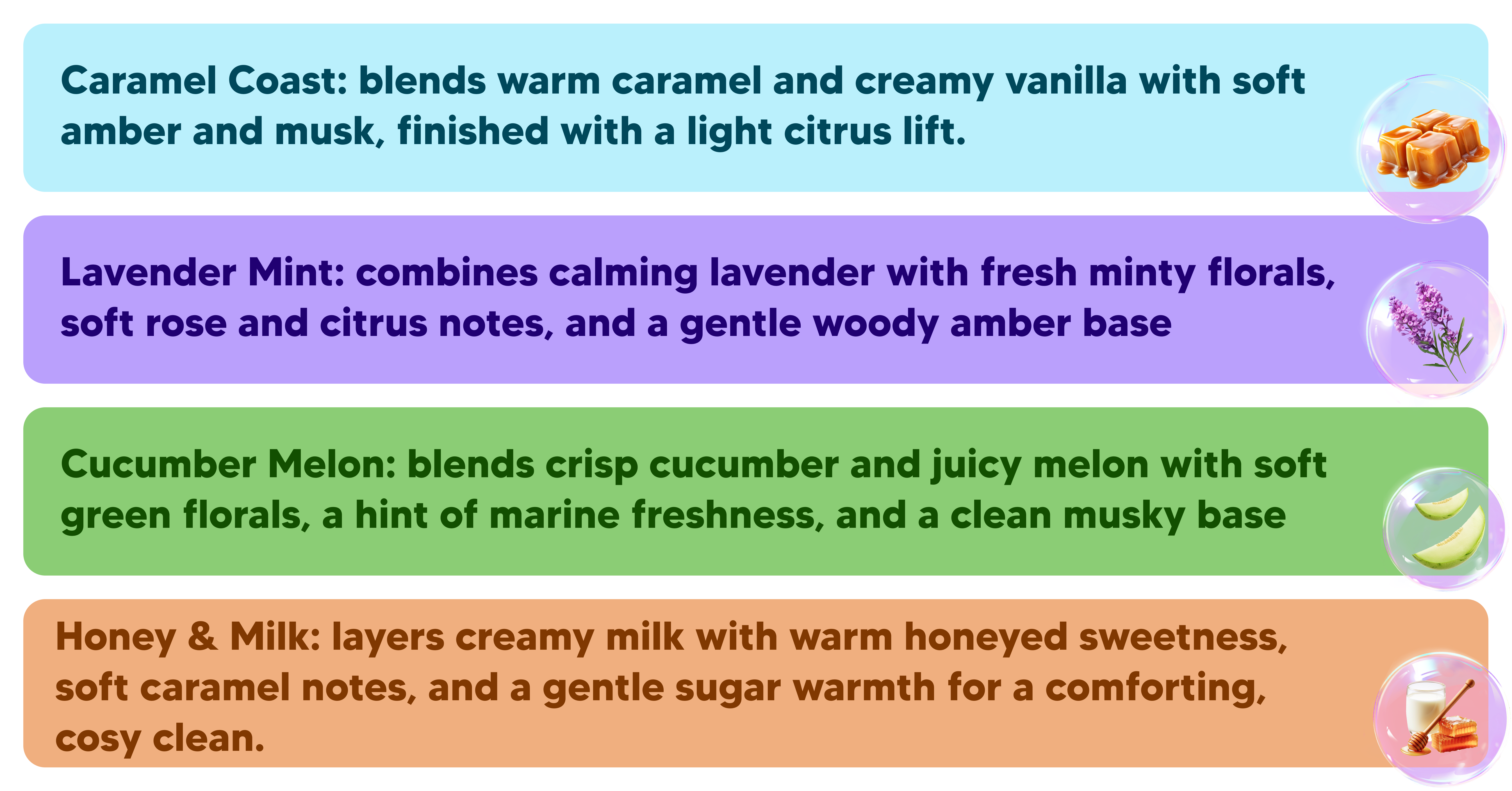 • Lavender Mint: A calming burst of herbal freshness in every wash! Soothing lavender and bright palmarosa oil extracts blend with soft rose and citronella extracts for a clean, airy lift. A hint of clove and delicate jasmine adds warm floral depth, leaving your hands refreshed, balanced, and beautifully serene.