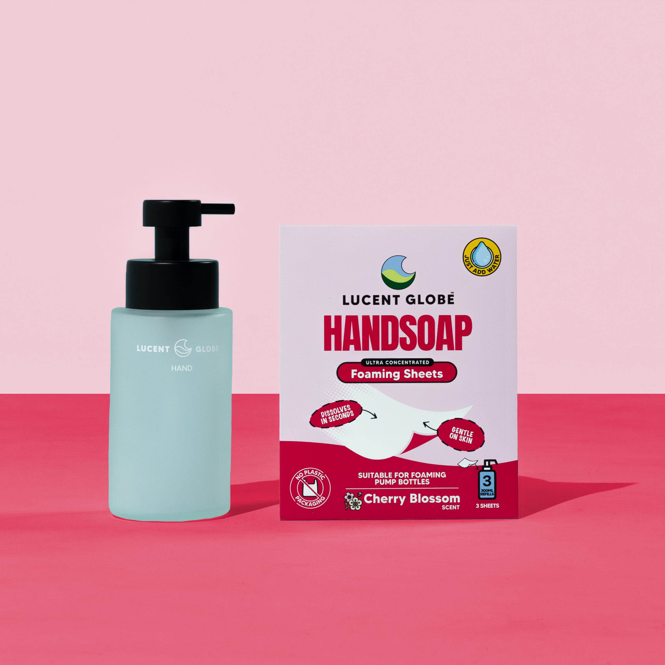 The ultimate hand care duo: Luxurious Cherry Blossom-scented foaming hand soap sheets paired with a sleek, reusable glass bottle - perfect for every home.